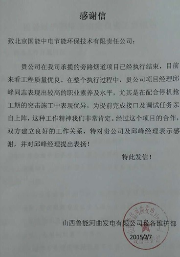通過河曲EPC項目團(tuán)隊的共同努力,我司承攬的山西魯能河曲發(fā)電有限公司旁路煙道EPC項目,工程建設(shè)質(zhì)量優(yōu)良,并在項目執(zhí)行過程中,現(xiàn)場團(tuán)隊表現(xiàn)出較高的職業(yè)素養(yǎng)及水平,受到業(yè)主的一致贊譽(yù),同時也與業(yè)主建立了良好的合作關(guān)系。
