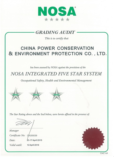 7月13日,經過NOSA科學、嚴格地考評,國能中電被正式授予“NOSA五星管理系統”三星級證書。