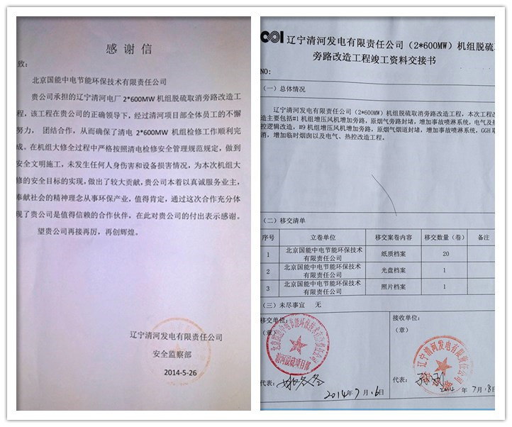 在公司總部的正確領(lǐng)導(dǎo)下,經(jīng)過清河EPC旁路改造項目部全體成員的共同努力,7月18日,遼寧清河發(fā)電有限責(zé)任公司業(yè)主代表在竣工資料交接證書上簽字,標(biāo)志著我公司承擔(dān)的遼寧清河電廠2*600MW機(jī)組脫硫取消旁路改造工程正式竣工驗收,成功打響了我司在中國電力投資集團(tuán)的第一槍。