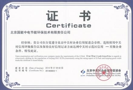 榮獲“中關村示范區信用一星級企業證書”